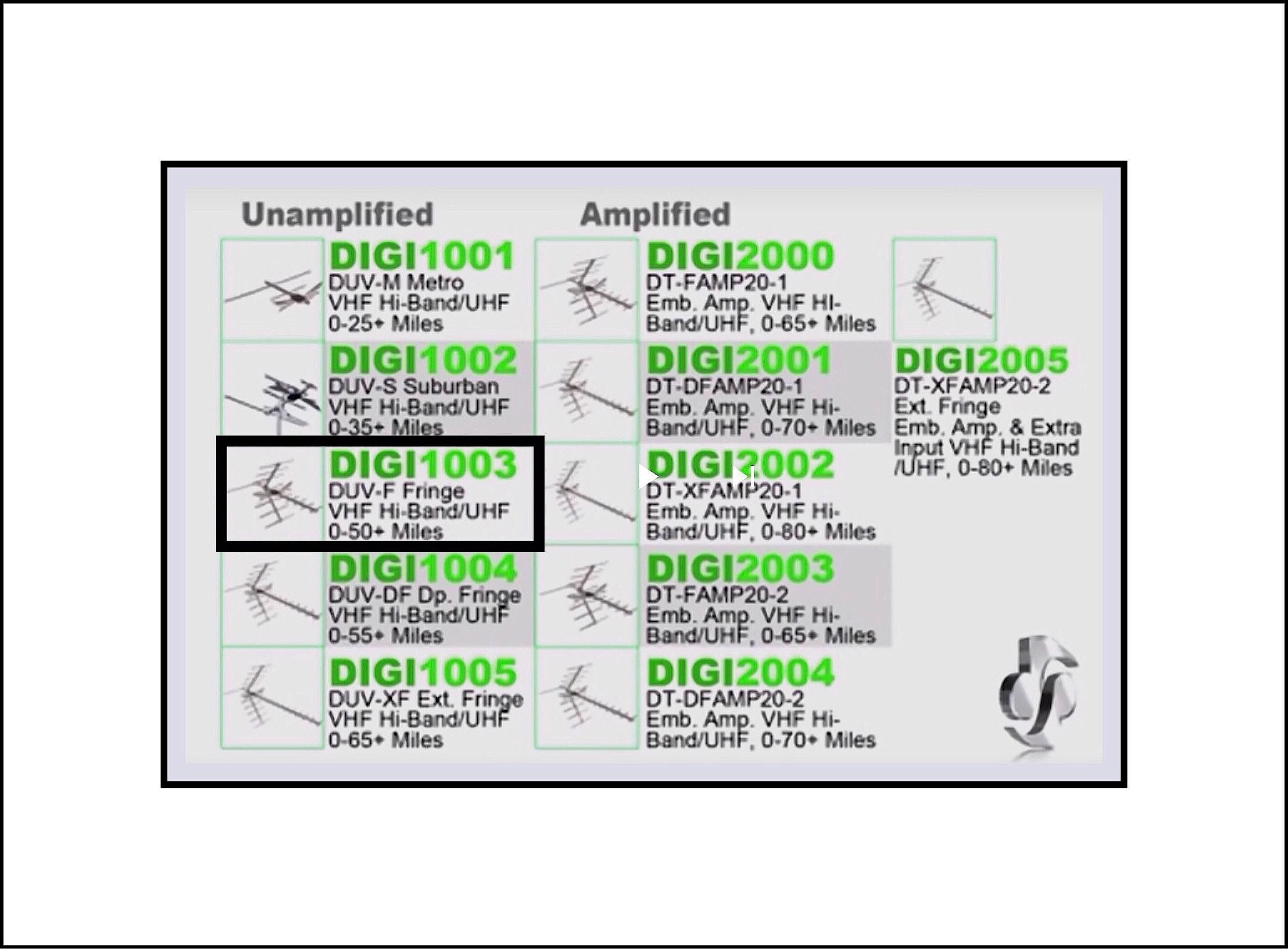 Our rooftop antenna is the DigiTenna DUV-F: Hi-Band