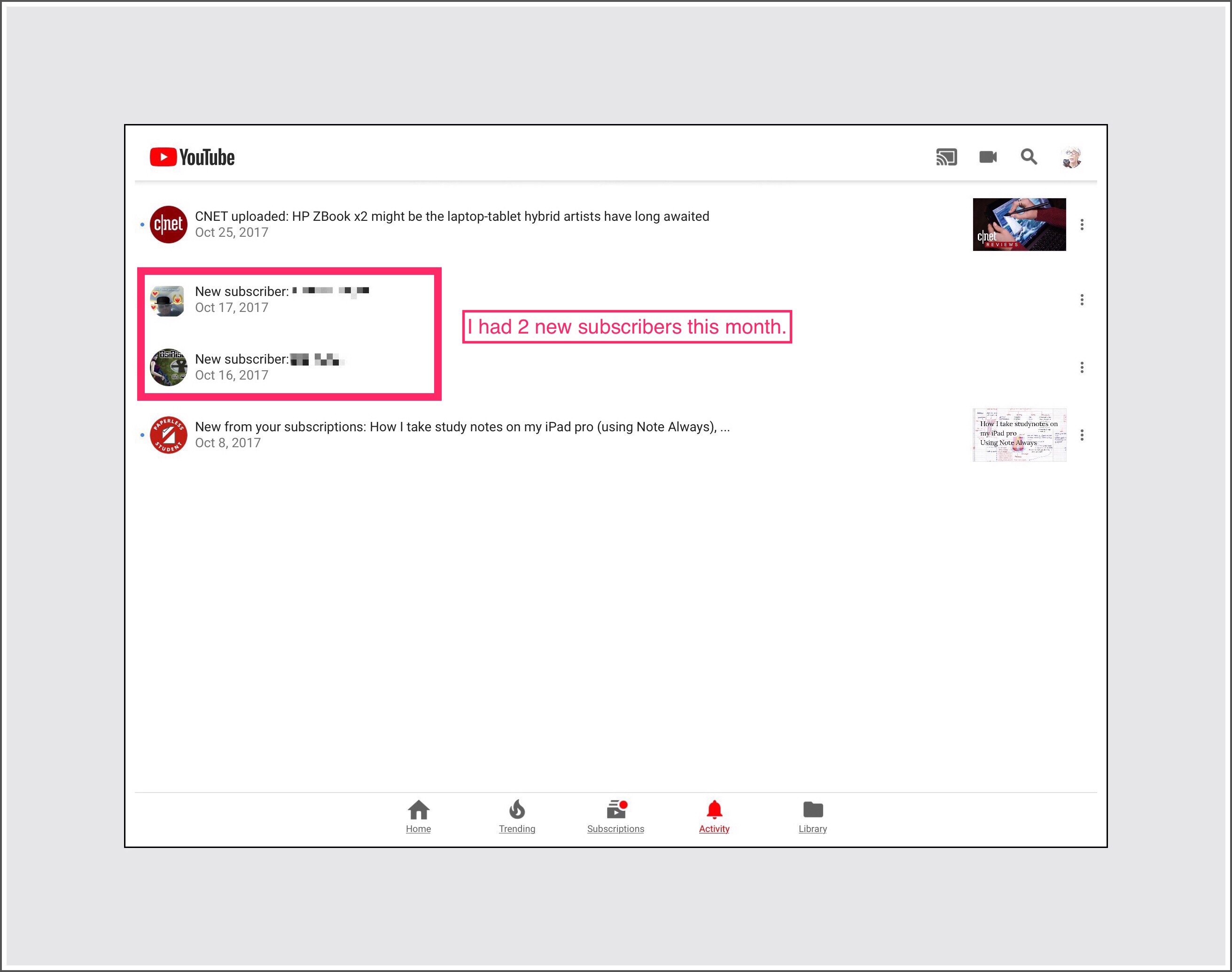 Today, by chance I discovered an easy way to see who your new subscribers are using the ios YouTube app. I thought others would like to know where to find this information as well. If you kept a list of your subscribers using the method described in my earlier post, you can just update it occasionally by adding the new subscriber names you’ll find using this newer method.