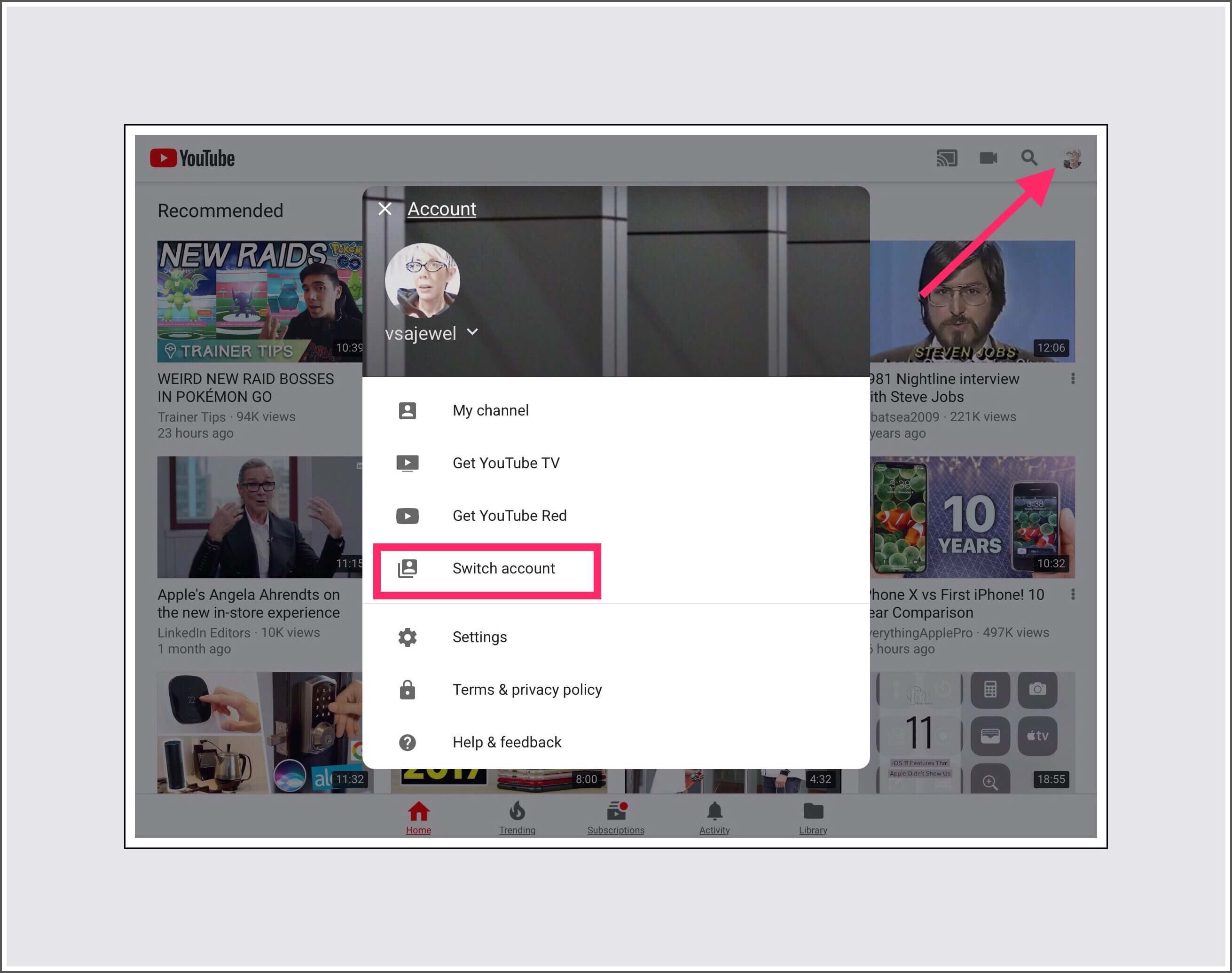 Make sure you’re signed into your Google account for the YouTube channel you’re interested in seeing the new subscribers for. To check your Google account you should see your profile picture in the upper right hand corner. If you tap on it, the view shown in the screenshot below will display and you can change accounts by tapping on ‘Switch Account.’